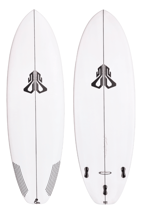 Vous pouvez la monter en 3 fins ce qui donnera du contrôle à la planche mais la version préféré du shaper est le Twin + 1.